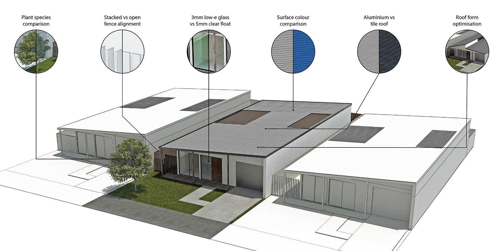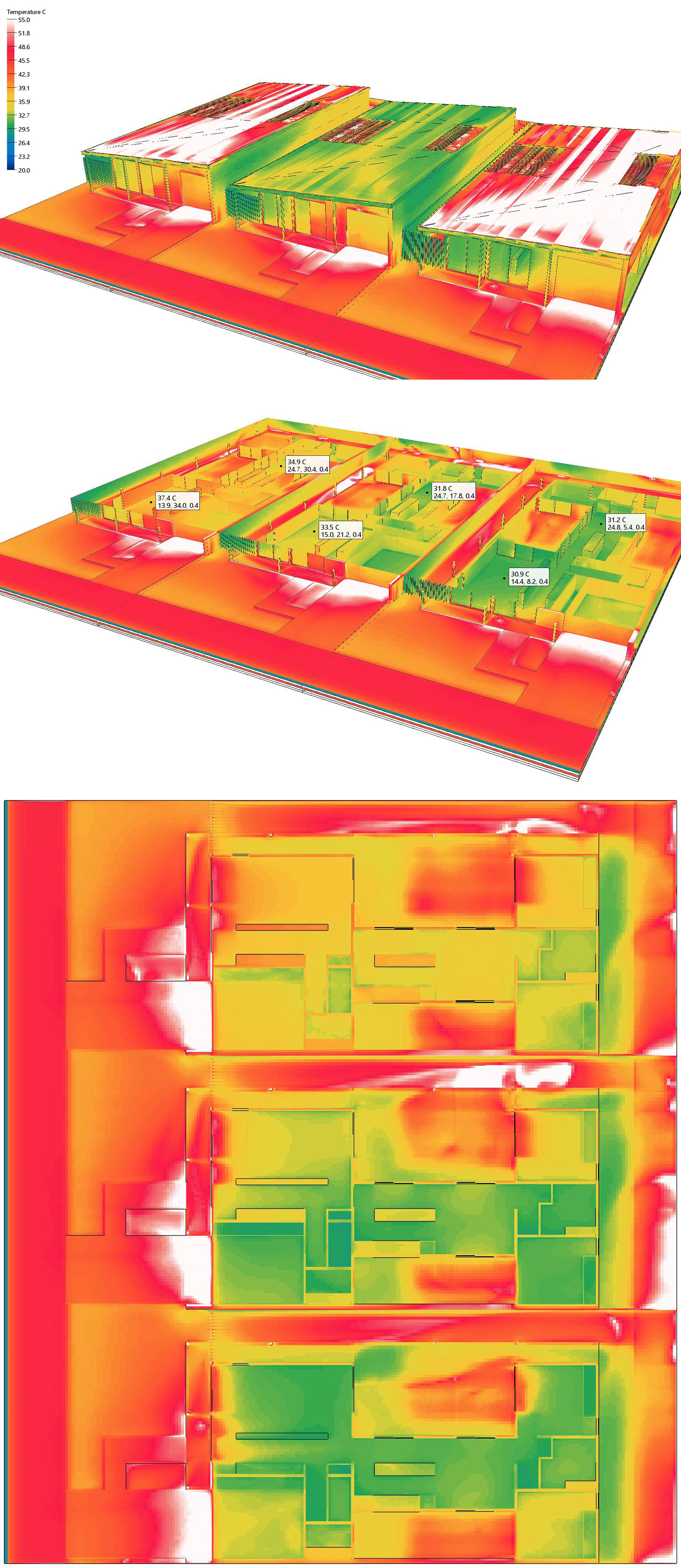 Unlike static rating systems, these simulations are dynamic. They can test multiple scenarios—comparing, for example, the difference between a dark roof and a light roof, or the impact of adding shading devices to a façade. The example below shows three homes with identical physical designs, but with the colour of the roof lightened for one, and simply having the doors and windows opened of another.