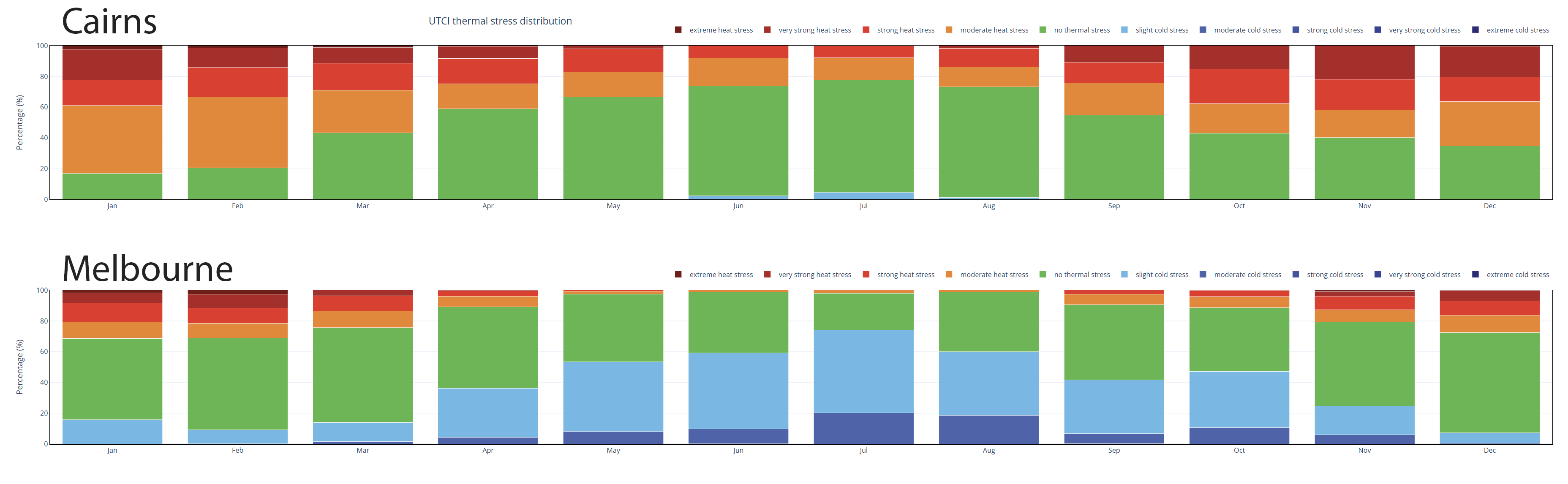 By way of comparison, the following charts show the percentage of time that each location experiences high levels of thermal discomfort. This particular website uses the UTCI (Universal Thermal Comfort Index) human comfort metric to determine the degree of heat risk. As per the below exmample, Melbourne has significantly less heat impacted days than Cairns, however the winter conditions in Melbourne can also create ‘cold stress’.
